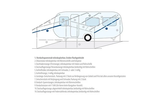 Spann- und Firststab teleskopierbar, Enden flachgedrückt. Passend um das Vordach zu spannen.